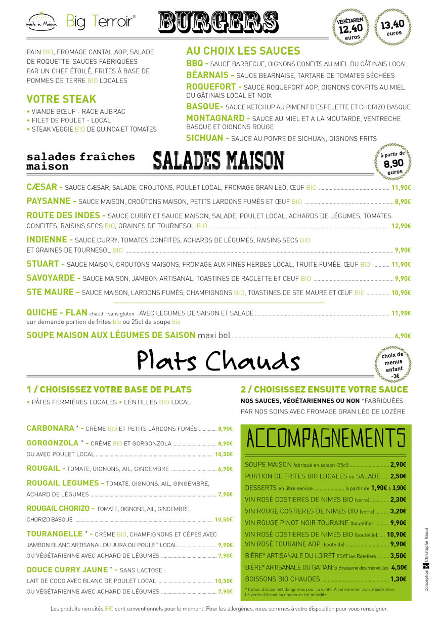 Nous mettons en avant les producteus locaux et les produits bio qui font la force de notre terroir, mais aussi des recettes maisons travaillées avec les produits d'un peu plus de 15 producteurs partenaires dans un rayon de 200 km autour du restaurant garantissant une tracabilité sur le contenu de votre assiette. Ainsi, que ce soit pour un tête à tête ou un repas entre amis, vous trouverez de quoi vous réconcilier avec la restauration rapide, en découvrant des plats végétariens, végataliens mais aussi sans gluten.